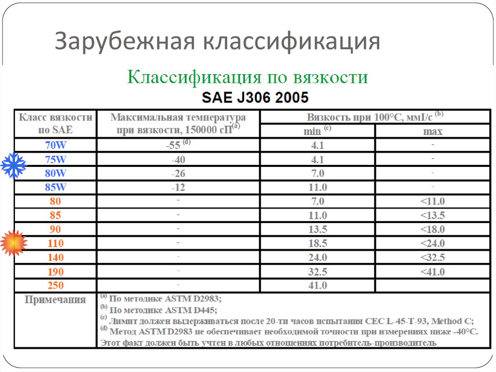 Классы в категориях обозначаются буквами латинского алфавита, стоящими после буквы, маркирующей категорию, например: SF, SH, СС, CD или SF/СС, CG/CD, СF-4/SН для универсальных масел.