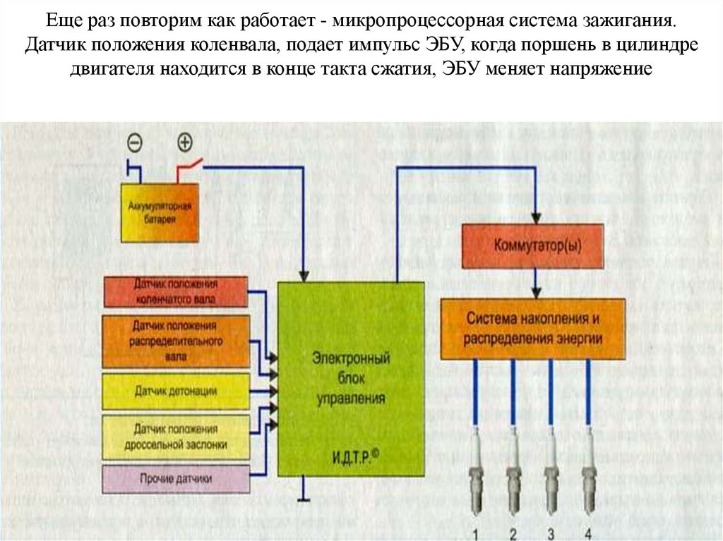 При отсечке тока магнитное поле наводит во вторичной обмотке ток высокого напряжения, который выводится через центральную клемму катушки и с помощью распределителя подается к свечам зажигания.