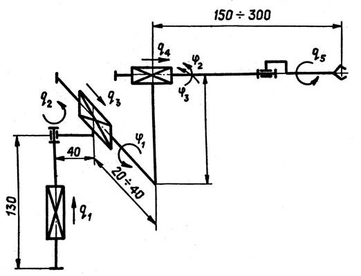 Осуществляя поворот этих схем с помощью вращательной пары, получим круговые обслуживаемые объемы, а обеспечив движение этих схем, например в плоскости перпендикулярной базовой плоскости, получим протяженный обслуживаемый объем, имеющий в сечении перпендикулярном направлению переноса форму обслуживаемой зоны. Наличие указанных трех кинематических пар позволяет осуществить перенос рабочего органа в пространстве. Однако с целью обеспечения заданной ориентации рабочего органа манипулятор должен быть оснащен еще добавочными звеньями с приводами. Общее число степеней подвижности кинематической схемы манипулятора (в этом случае для произвольной ориентации предметов) должно быть равно шести. Однако, если ради простоты используется раздельное управление каждым приводом, то шести степеней подвижности оказывается уже недостаточным для выполнения рабочих операций с предметами, связанными кинематически с неподвижными объектами. Поясним это на простейшем примере. Для того чтобы поднять и повернуть ящик письменного стола для его установки в направляющие, достаточно иметь манипулятор с шестью степенями подвижности.