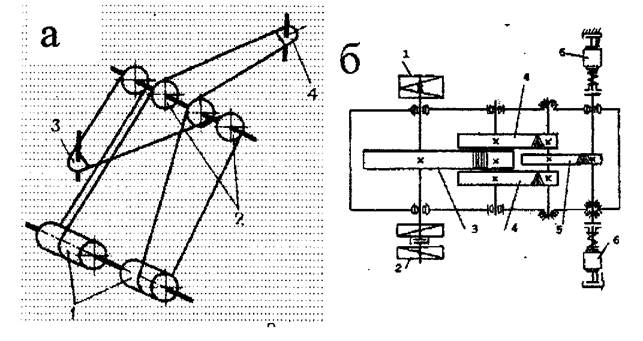 Во второй группе кинематических схем используется произвольное расположение звеньев и кинематических пар, при этом движение, например в плоскости, может быть организовано использованием совместной работы не менее трех кинематических пар. При этом законы движения звеньев (даже при простых законах движения рабочего органа) оказываются очень сложными, поэтому эта группа кинематических схем получила наименьшее распространение.