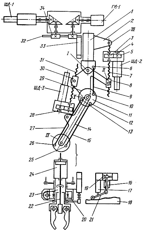 В работе указывается, что вид кинематической схемы задающего устройства должен быть определенным образом связан с видом кинематической схемы руки человека, что и предопределяет применение для копирующих манипуляторов кинематических схем, содержащих в основном вращательные пары. Из-за конструктивных трудностей, связанных с получением достаточно больших перемещений (больше 0,5 м) поступательных пар, они находят ограниченное применение в манипуляторах. При разработке копирующих манипуляторов возникают трудности с созданием кинематически подобных управляющих механизмов с высокой чувствительностью.