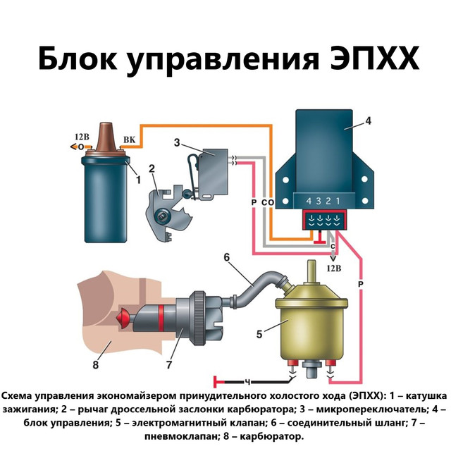 При падении оборотов до 1900 об/мин ЭПХХ возобновляет подачу топлива через СХХ карбюратора, чтобы не дать двигателю заглохнуть.