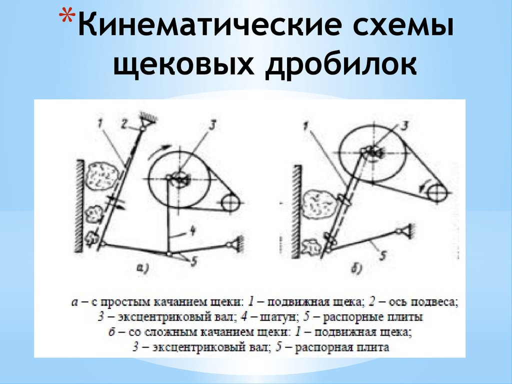 Щековая дробилка с простым движением подвижной щеки работает следующим образом. Крутящий момент от электродвигателя передается клиноременной передачей на эксцентриковый вал. Вал приводит в движение шатун, шатун – распорные плиты, которые передают движение подвижной щеке. Щека совершает на оси маятниковые колебания. Нижний конец щеки проходит