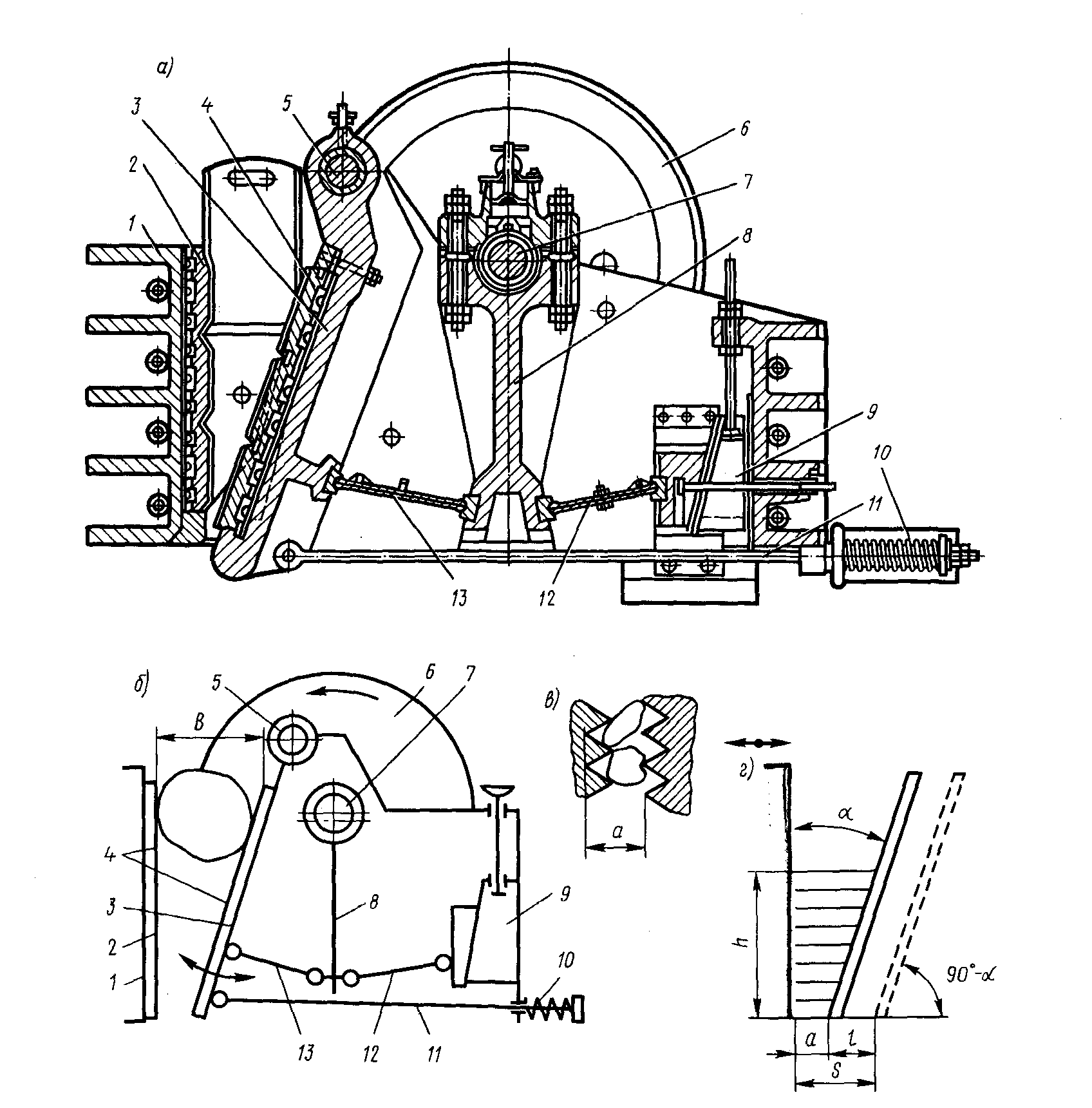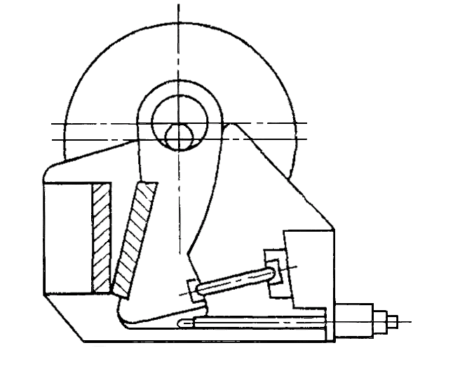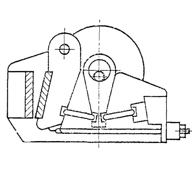 Принципиальная схема щековой дробилки Блейка показана на рис. Он имеет фиксированную челюсть и подвижную челюсть, которая поворачивается вверху. Челюсти не расположены так, чтобы образовать V-образную открытую вершину. Качающаяся челюсть, совершающая возвратно-поступательные движения в горизонтальной плоскости, обычно составляет с неподвижной челюстью угол 20—30°.