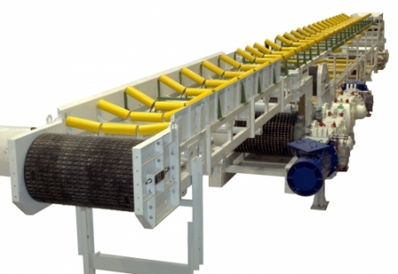 - состоит из жёлоба и перемещающих по нему сыпучий материал скребков, крепящихся обычно на кольцевой цепи; разгрузка может осуществляться как в конце конвейера, так и через отверстия в желобе.