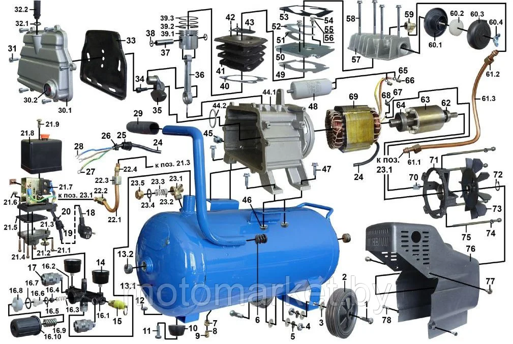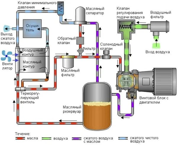 Самой очевидной частью любого компрессора является накопительный бак. Сжатый воздух, хранящийся в этом резервуаре, обеспечивает непрерывную подачу постоянного давления. Однако не во всех компрессорах используется резервуар для хранения, поскольку некоторые небольшие или переносные компрессоры доставляют сжатый воздух непосредственно по воздуховодам. С баком или без него воздушный компрессор по-прежнему имеет два важных компонента, которые необходимы для работы. Этими неотъемлемыми частями являются двигатель компрессора и головка компрессора.