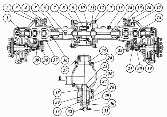 1 — механизм регулировки колеи; 2 — крышка моста; 3 — корпус сальника; 4 — прокладки регулировочные; 5 — стакан; 6, и 21— подшипник; 7 — обойма сальника; 8 — соединительный фланец; 10, — гайки; 11 —маслоотгонное кольцо; 12 — регулировочные шайбы; 13 — ведущая шестерня; 14 — ведомая шестерня; 15 — корпуса дифференциала; 16 — ось сателлитов; 17—чашка нажимная; 18 — сапун; 19 — диск ведомый; 20 — диск ведущий; 22 — корпус моста; 23 — болт дифференциала; 24 — сателлит; 25 — заглушка; 27 — прокладки регулировочные; 28 — полуосевая шестерня; 29 — прокладки регулировочные; 30 — клин; 32 — стопорная планка; 33 — передний брус; 34 — ось качания; 35 — втулка бруса.