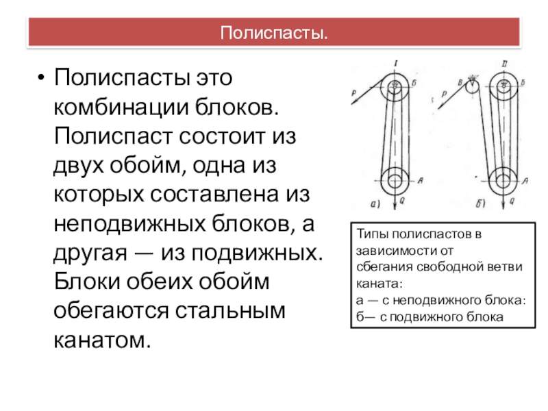 закрепления роликов. Полиспасты, дающие выигрыш в усилии, называют силовыми, чем больше кратность (выигрыш), тем медленнее будет происходить подъем груза.