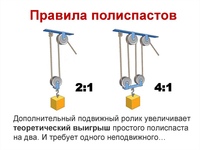 Каждый тандем подвижного и неподвижного ролика системы дает уменьшение прилагаемого усилия двукратно. Выигрыш в силе можно узнать также, посчитав количество тросов, идущих от груза или от точки