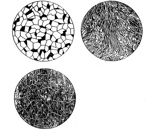 В системе Fe-Fe3C можно приготовить сплавы железо-углерод различного состава. Их равновесные структуры различны при разных температурах, но они состоят из нескольких основных фаз (феррит F, аустенит A и цементит Fe3C). Эти основные фазы объединяются в виде механических смесей, образуя в стали богатую и красочную металлографическую структуру. Существует восемь распространенных металлографических структур: