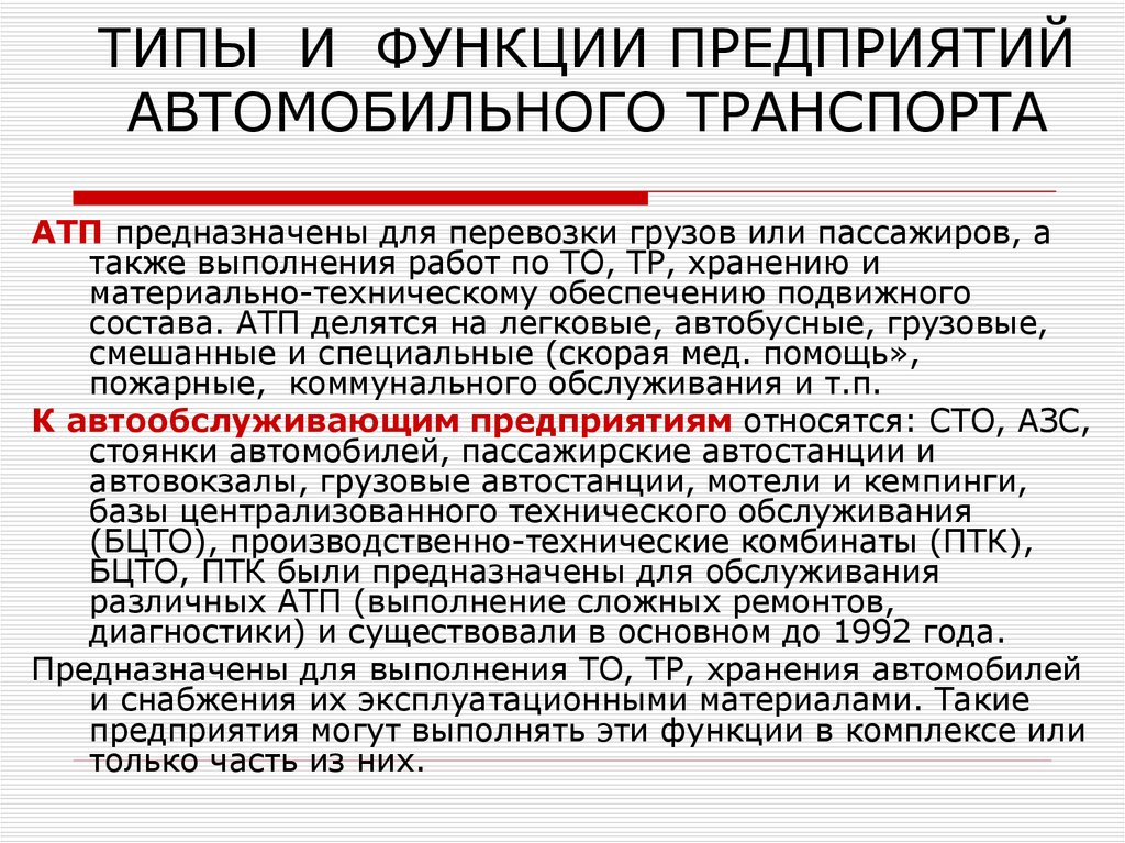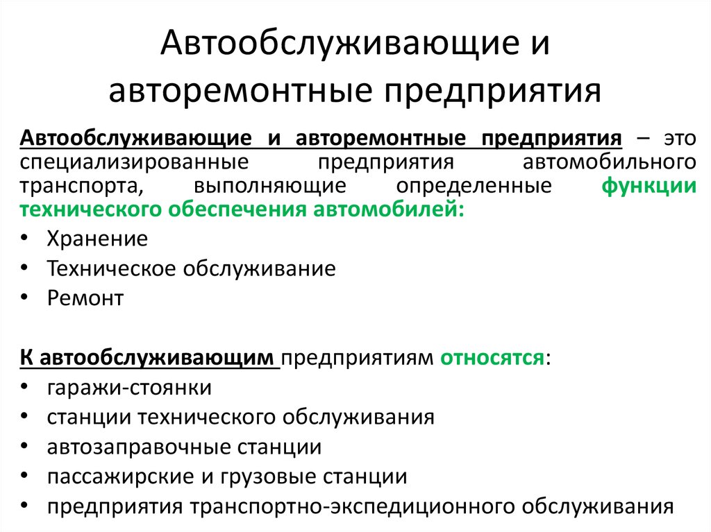 Автообслуживающие и авторемонтные предприятия – это специализированные предприятия автомобильного транспорта, выполняющие определенные функции технического обеспечения автомобилей: • Хранение • Техническое обслуживание • Ремонт К автообслуживающим предприятиям относятся: • гаражи-стоянки • станции технического обслуживания • автозаправочные станции • пассажирские и грузовые станции • предприятия транспортно-экспедиционного обслуживания