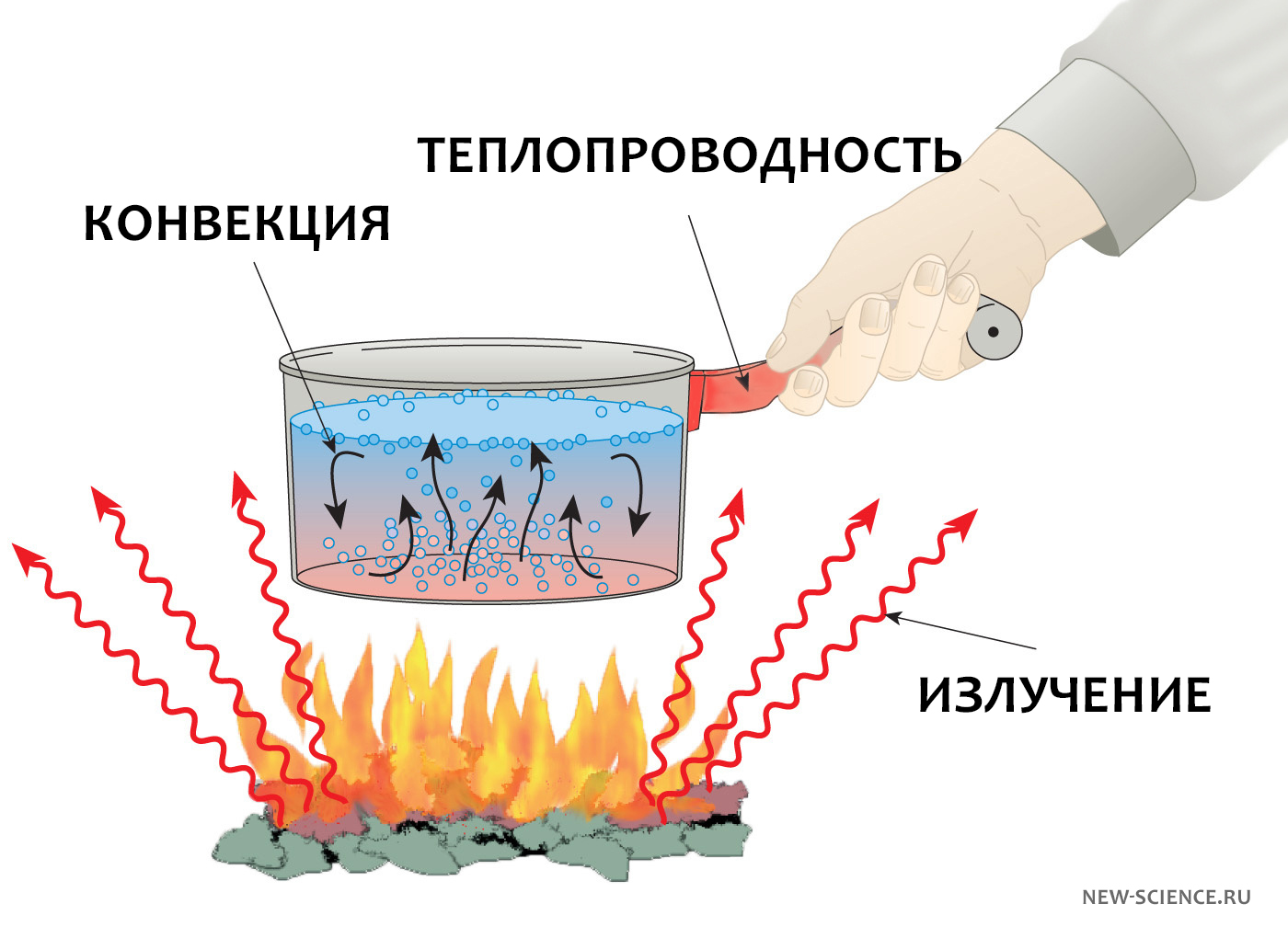 В таком случае тепло от более нагретого тела (кружки) передается менее нагретому (вашим рукам), до тех пор пока температура двух объектов не станет одинаковой. Так, горячая вода отдает свое тепло холодной при смешивании, а суп нагревает холодную ложку, если ее оставить в тарелке. Только аккуратно, не обожгитесь!Конвекция — вид теплообмена, при котором внутренняя энергия передается струями и потоками самого вещества. Проще говоря, это процесс, который происходит в жидкостях и газах, когда слои вещества разной температуры перемешиваются. На этом принципе основано отопление помещения и проветривание комнаты. Кстати, ветры, дующие над поверхностью земного шара, — это тоже пример конвекции.