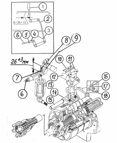 совмещают отверстия переключающего валика и заднего моста. Сделать это можно при помощи рычага управления. Когда отверстия совпадают, в них заворачивается установочный болт;