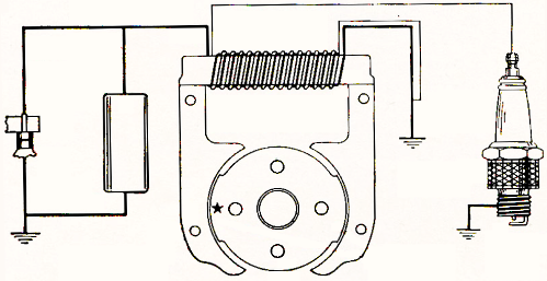 При вращении якоря первичные обмотки пересекают силовые линии магнитного поля и в первичной цепи течет индуцированный ток. Когда первичный ток достигает своего максимального значения в каждом направлении, первичная цепь внезапно размыкается контактным выключателем, и ток падает. Это действие индуцирует очень высокое напряжение во вторичной обмотке, что вызывает мгновенный скачок искры в промежутке свечи зажигания. Предусмотрен распределитель, который проводит ток к свече зажигания по проводам высокого напряжения. Конденсатор служит для устранения дугообразования в точках выключателя и усиления тока во вторичной цепи. Для многоцилиндровых двигателей требуется распределитель и ротор для распределения тока по разным свечам зажигания.