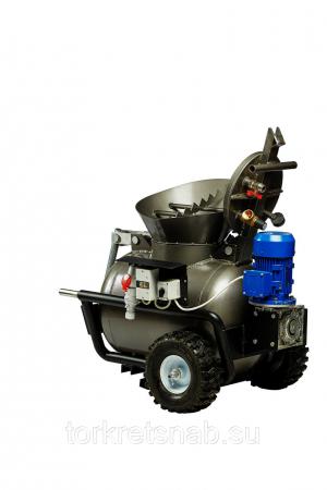 Сухая смесь, под действием силы тяжести заполняет цилиндры барабана с одной стороны, и после вращения, освобождается под действием воздуха, с противоположной стороны. Дополнительный воздух вводится в выпускную магистраль для того чтобы обеспечить надлежащий объем смеси и сбалансировать исходящий поток смеси по шлангу. В конструкции торкрет установки чашеобразного типа используется одна уплотнительная плита на поверхности вращающегося элемента (Рис. 4).