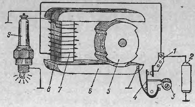 Этот магнитный поток наводит в витках первичной обмотки э.д.с., под действием которой в обмотке протекает переменный ток. Так как магнитный поток пересекает также и витки вторичной обмотки трансформатора, то в ней индуктируется э.д.с. порядка 1500 в. Э.д.с. вторичной обмотки недостаточна для преодоления искрового промежутка между электродами свечи. Ток низкого напряжения первичной цепи создает вокруг сердечника трансформатора большой магнитный поток. Когда ток в первичной обмотке достигает наибольшей величины, кулачок 9 набегает на выступ рычажка прерывателя и первичная цепь размыкается. Магнитный поток, пересекая с большой скоростью витки вторичной обмотки, индуктирует в ней э.д.с. высокого напряжения, и между электродами свечи происходит искровой разряд, воспламеняющий рабочую смесь. Одновременно с возникновением э.д.с. во вторичной обмотке в первичной обмотке образуется э.д.с. самоиндукции, достигающая 300 в. Эта э.д.с. заряжает конденсатор, этим самым уменьшается искрение между контактами, увеличивается резкость исчезновения тока в первичной цепи и созданного им магнитного потока и повышается э.
