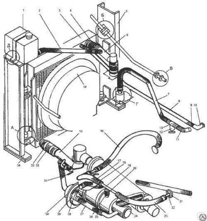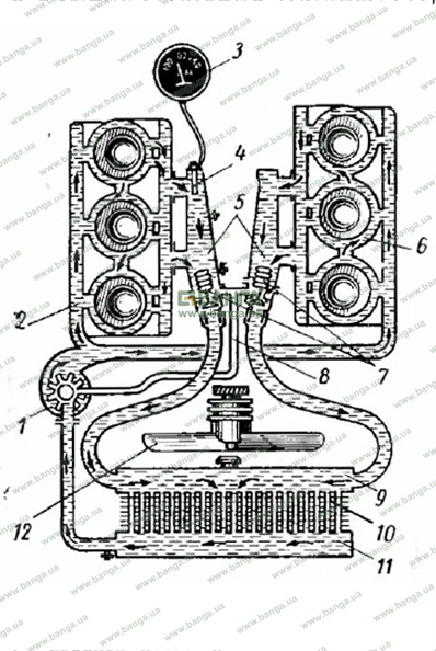 Из водосборных трубопроводов через термостаты нагретая жидкость по двум дюритовым (прорезиненным) шлангам поступает в верхний бачок 9 радиатора, из которого она по трубкам 10 опускается в нижний бачок радиатора.