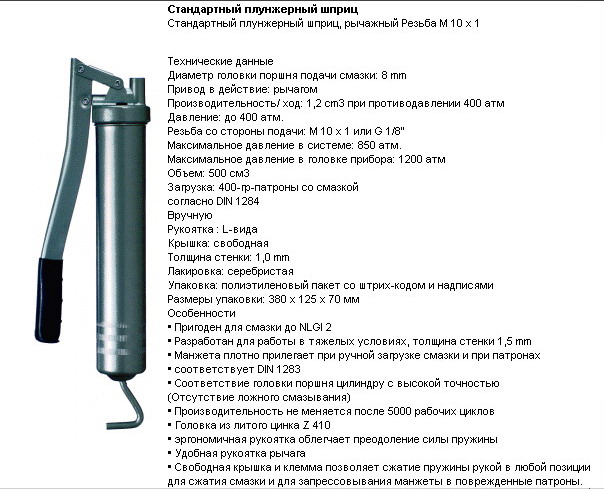 • Механические. Пользоваться такими шприцами очень легко. Для смазывания любого элемента в автомобиле нужно наполнить смазкой пистолет и надавить несколько раз на рукоятку. Механические устройства подразделяются на несколько подклассов. Речь идет о рабочем давлении и объеме бачка для смазки. Цифра, обозначающая объём, скажет о том, на сколько хватит смазки, находящейся в шприце. А на интенсивность смазки влияет давление, что значит, чем больше давление, тем интенсивнее будет струя смазки.