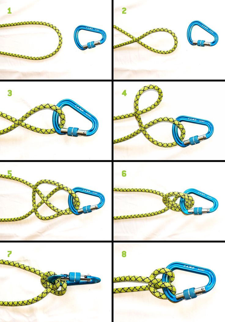 По центру веревки делается петля. Из нее формируется восьмерка. Полученные 2 петельки складываются вместе по направлению вниз. В результате получается узел, который после затяжки на предмете не распускается, даже если его концы не зафиксированы. Его используют для связывания рук вместо наручников, а также завязывания мешков.
