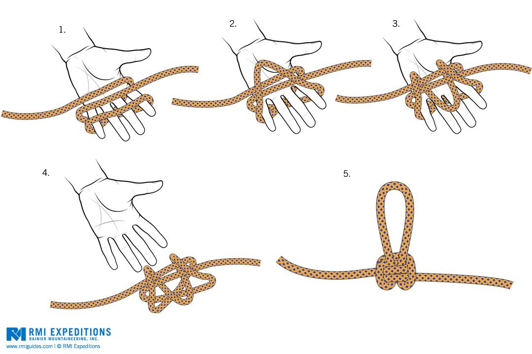 Этим способом можно быстро завязать узлы на веревке с одинаковым интервалом, что понадобиться для удобного спуска по ней. Конец веревки берется в левую руку. Правой делается захват длинного края на ширину руки, и из него сворачивается петля. Она без оборотов передается в левую ладонь. Таким способом набираются кольца со всей бухты. Далее конец веревки продевается во все петли сразу. Он зажимается в руке, поднимается вверх и остальная бухта отпускается. В результате по всей ее длине затянутся опорные узлы.
