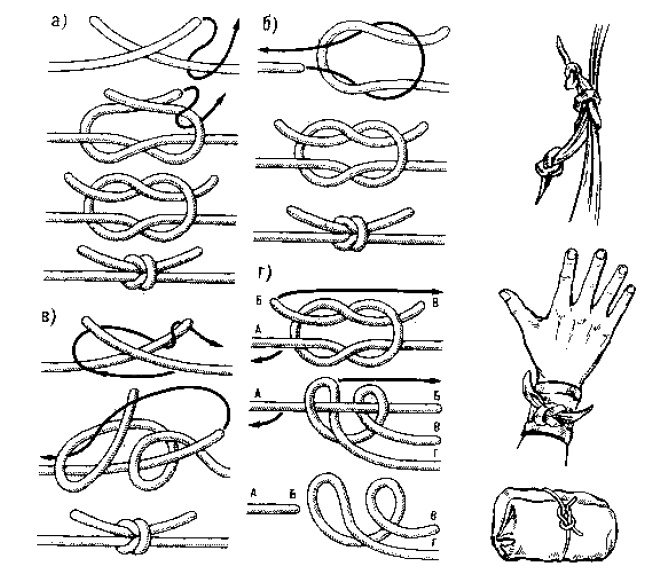 – обычный способ вязки; б – морской способ вязки; в – ткацкий способ вязки; г – морской способ развязывания