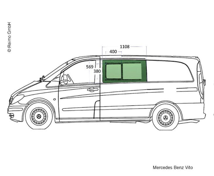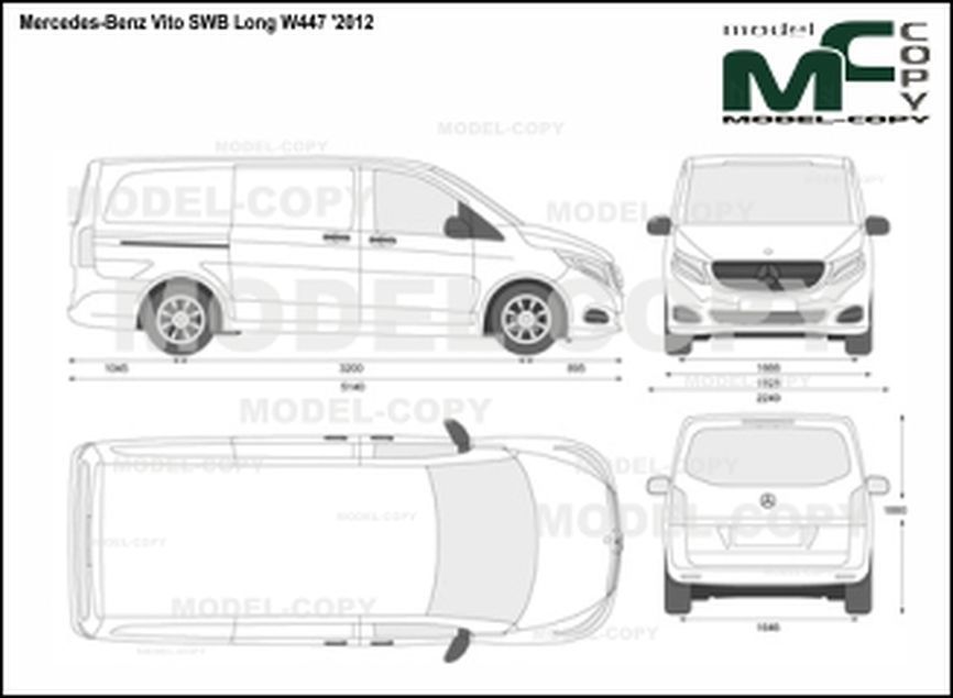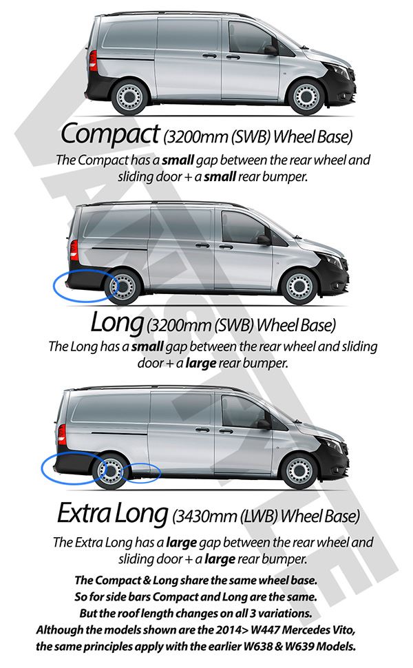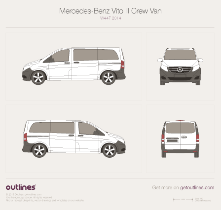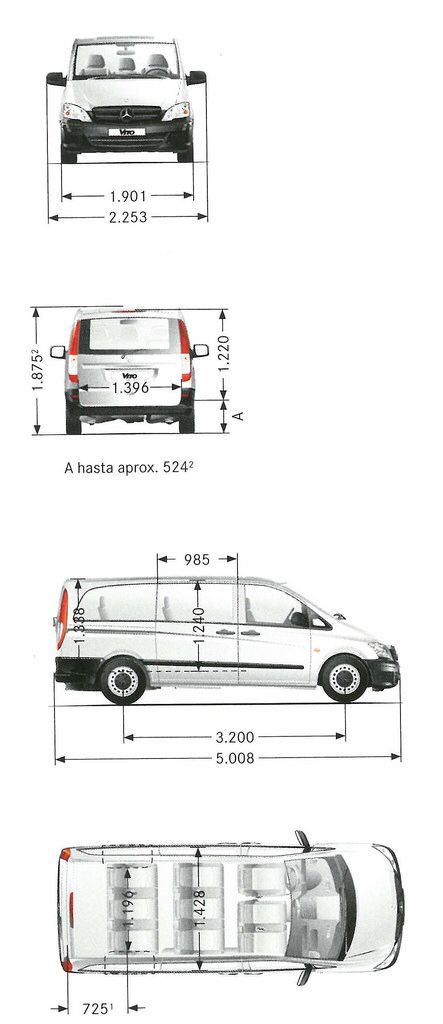 Также есть 3 варианта длины кузова. Укороченный и длинный задний свес предлагался для стандартной колёсной базы, а с длинной базой всегда шёл удлиненный свес. Таким образом, длина Vito составляет 4,7, 5,0 и 5,2 метра. Также есть вариант с увеличенной на 40 см высотой крыши. В салоне может быть 8 посадочных мест, включая место водителя.