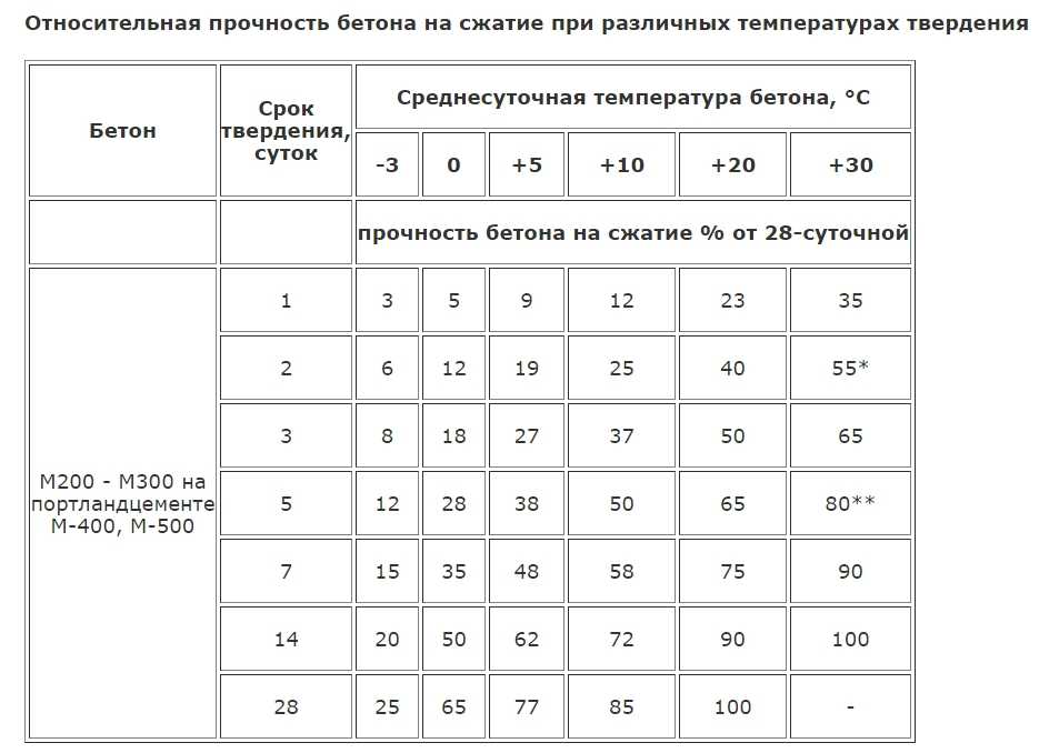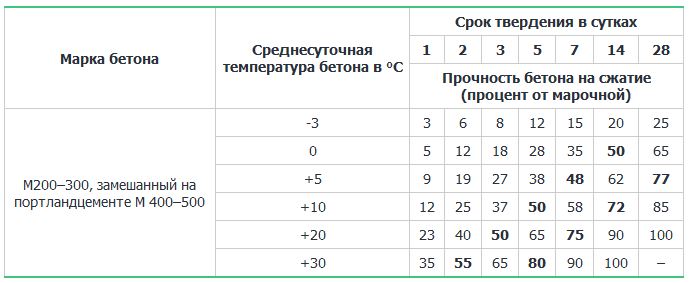 Температура от 0 до +10 градусов является низкой для гидратации бетона. Поэтому процесс набора прочности при таких температурах серьезно затормаживается. Например, если процесс набора прочности происходит при температуре +20 градусов, то за неделю состав из бетона наберет прочность в 70%. а если этот процесс происходит при температуре +5 градусов, то бетон будет набирать 70% прочности в течение трех недель или месяца.