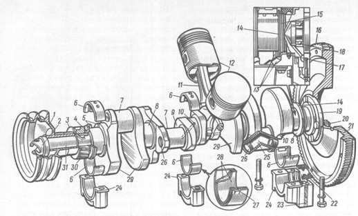 Сцепление заключено в картере 13, закрепленном на блоке цилиндров.Для выключения сцепления скользящий муфта с подшипником усилие передается от педали управления через гидравлический или тросовый привод.Крутящий момент от двигателя!Через маховик и нажим!Диск 11 передается на ведомый диск 12, а от него через демпферные пружины 17 на ступицу раба ди ск и шлицевое соединение ведущего вала редуктора 16.