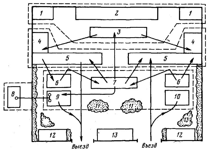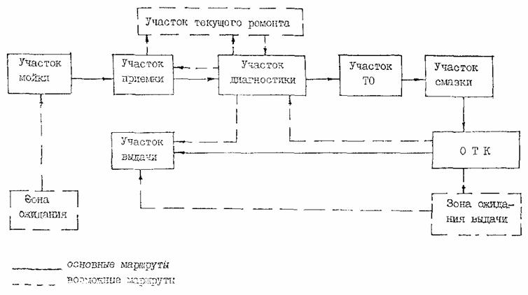 Все работы по диагностированию и основным регулировкам выполняются до поступления автомобиля на линию ТО-1. После диагностирования у автомобиля, поступившего на посты линии ТО-1, выполняют главным образом крепежные и смазочные работы. Такая схема требует большей площади для всей зоны технического обслуживания.