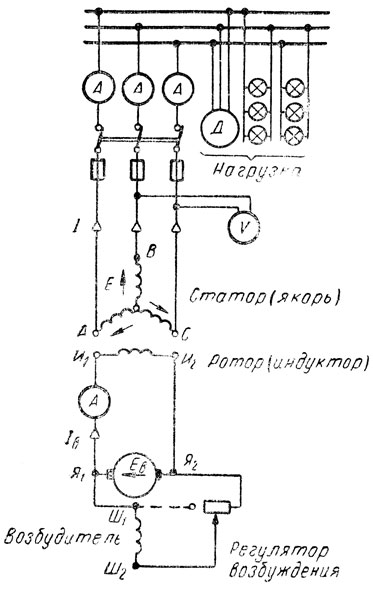 Схема подключения синхронного генератора к электрической сети на параллельную работу с другими генераторами показана на рис. 2.