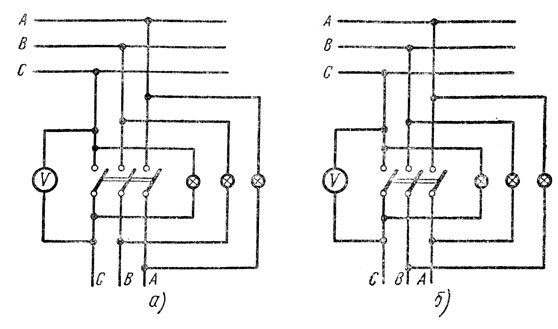 Кроме того, необходимо, чтобы проверяемые вольтметровым переключателем ВП напряжения генератора и сети, взятые между любыми двумя проводами, были равны по величине и противоположны по фазе.