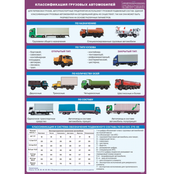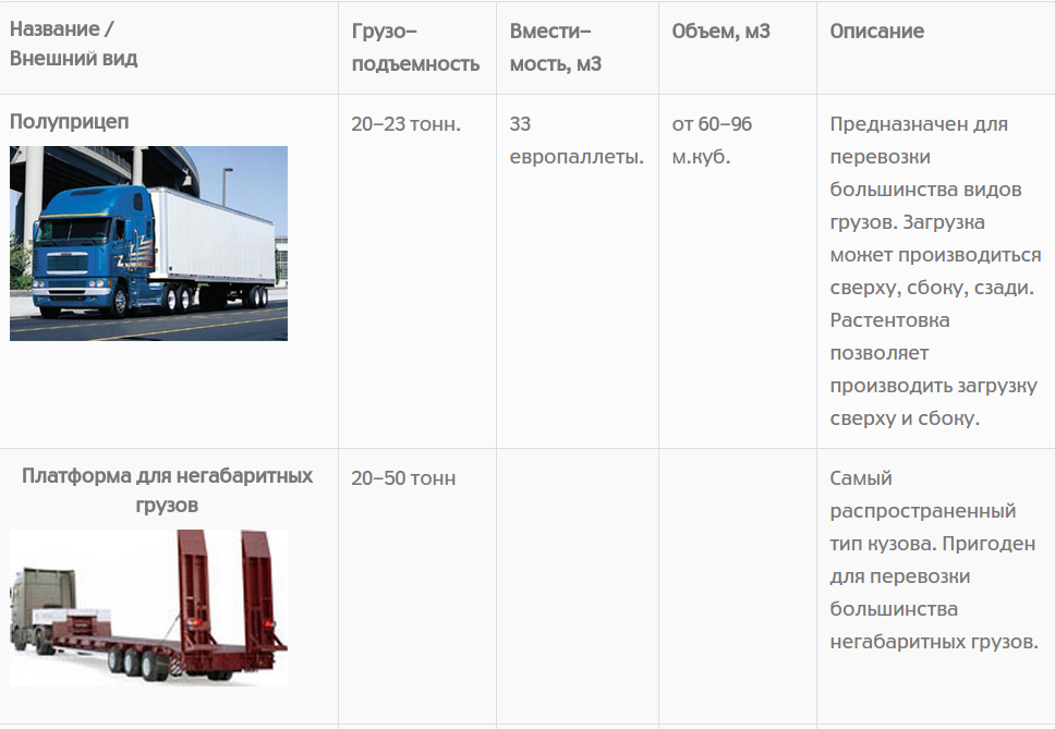 По конструкции делятся на бортовые, самосвалы, платформы, тентованные, рефрижераторы и специализированные модели.