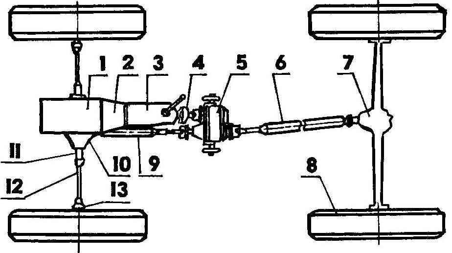 относительно оси 1—I (рис. 63, б, в). Корпус выдвижной опоры 3 крепится