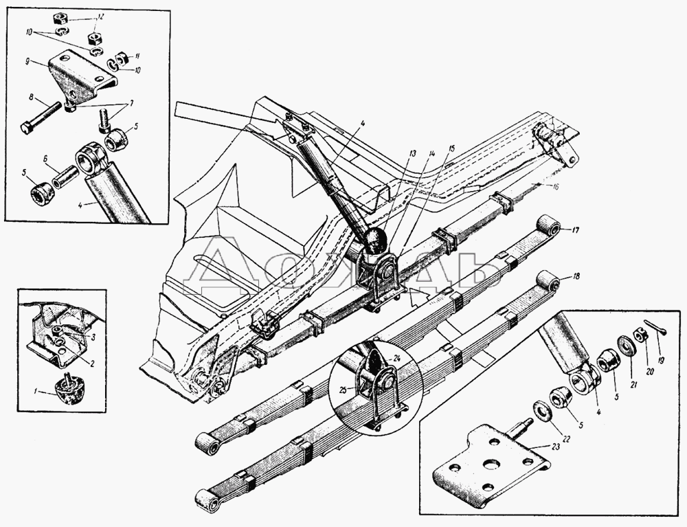 На цилиндрический конец опоры посажен бугель, при помощи которого опора прикреплена к корпусу заднего моста болтами. Дополнительно бугель закреплен на опоре болтами.