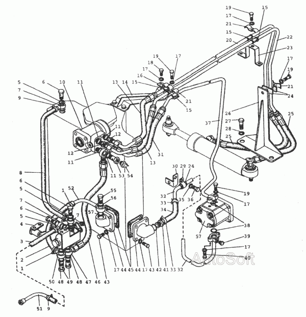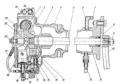 Основными элементами рулевой гидросистемы представляются распределитель, насосные устройства дозатора и цилиндра, а также датчик автоматической блокировки заднего моста транспортного средства. Рассматривая конструкцию гидроусилителя более подробно, необходимо упомянуть следующие важные элементы: