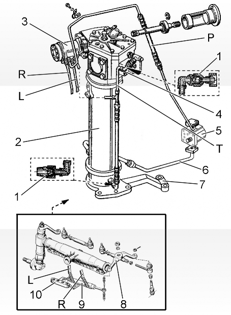 Итак, ГУР являет собой промежуточный элемент, осуществляющий связь гидравлического и механического характера между направляющими колёсами и рулевым управлением трактора, в функции которого входит увеличение маневренности транспортного средства в процессе движения и снижение усилий, прилагаемых для вращения рулевого колеса. Поворотный угол управляемых колёс в этом агрегате состоит в прямой пропорциональности с углом, имеющим отношение к повороту самого рулевого колеса. Система ГУР включает в себя такие компоненты: