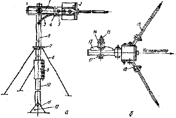 Ходовая нитка идет от отводного ролика на оголовке стрелы к отводному ролику у нижнего конца мачты и далее через опорную пяту на лебедку. Для того чтобы поддержать ходовую нитку, на верхней плоскости стрелы устанавливают поддерживающие валики. В нижней секции стрелы предусмотрены отверстия, с помощью которых осуществляется ее крепление на горизонтальном шарнире к мачте. Для уменьшения усилий в стреле при повороте предусмотрены расчалки из каната с натяжными муфтами, которые крепят к поворотному кругу, закрепленному к нижней секции мачты. Стрела подвешена стреловым полиспастом к оголовку мачты. Ходовая нитка полиспаста отводится по оси мачты на лебедку.