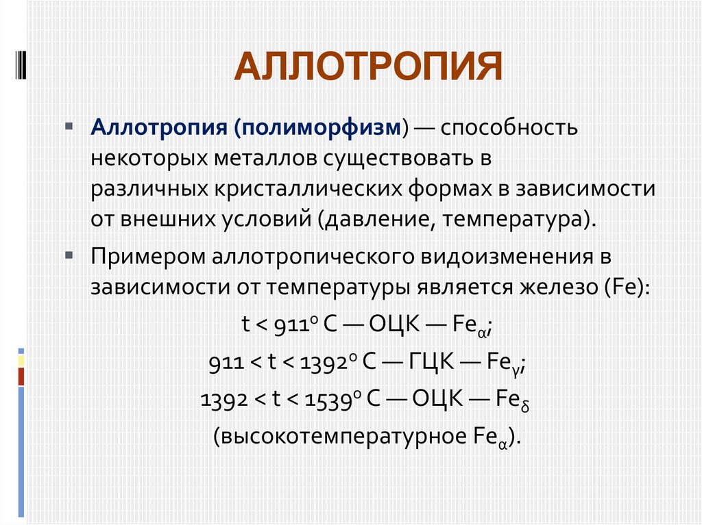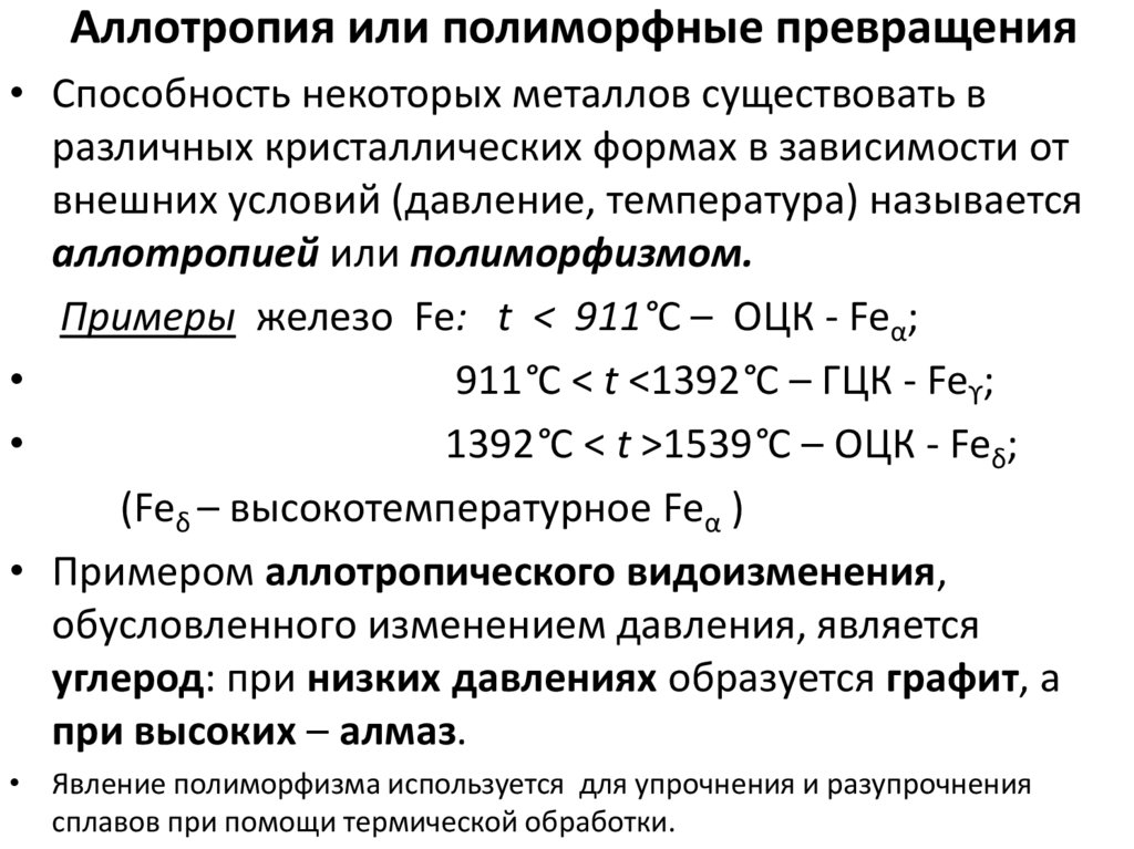 Аллотропические превращения возникают в структуре кристаллической решетки некоторых металлов при изменении температуры. Они представляют собой перегруппировку атомов и переход одного вида кристаллической решетки в другой, Существование одного металла в нескольких кристаллических формах называется аллотропией, или полиморфизмом, а процесс перехода из одной кристаллической формы в другую — аллотропическим превращением.