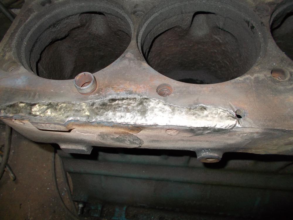 Повреждение заключается в трещине наружной рубашки охлаждения на углу блока. Одним концом она выходит к отверстию резьбы под шпильку крепления головки.