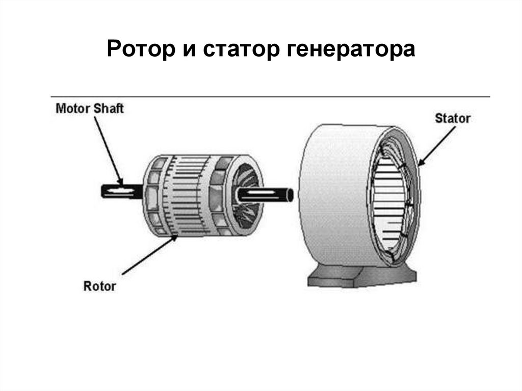 Генераторы состоят из вращающегося компонента, обычно ротора, который приводится в движение внешним источником механической энергии, таким как паровая турбина или двигатель внутреннего сгорания.