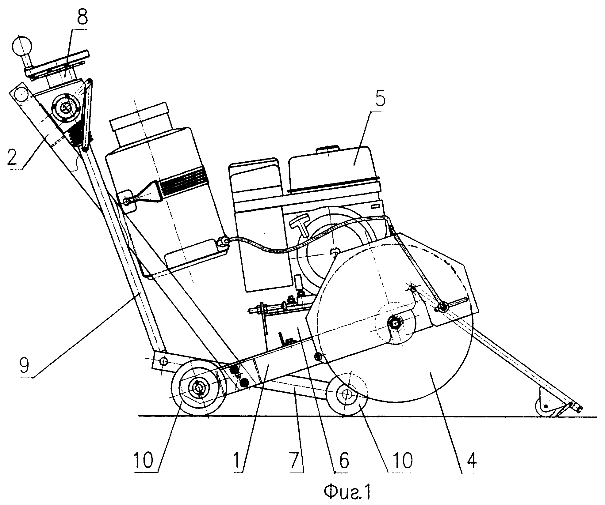 и плоскостью, проходящей через плоскость режущего органа машины. Вклю- 40 чается режущий дисковый орган 2 машины и разрезается ковер на длину 40-50см, Получившаяся полоса отрывается вручную от основания, заправляется между валами 6 и 10 и механизмом 11 прижима-подъема зажимается. Посредством цепной передачи 7 через редуктор 8 ведущий вал 6 приводится от электродвигателя 9 в движение, в результате чего за счет сцепления валов 6 и 10 машины с полосой ковра производится отрыв ковра от основания и движение машины в процессе резки и отрыва, Оторванная полоса ковра проходит между валами 6 и 10, свободно стелется под рамой машины на основание. В дальнейшем она может быть убрана с применением любых приемлемых способов, Использование машины предлагаемой конструкции по сравнению с известной обеспечивает повышение производительности труда за счет совмещения технологических операций и снижение уровня ручного труда и трудозатрат в целом.