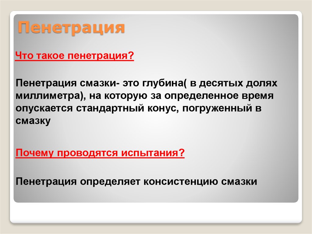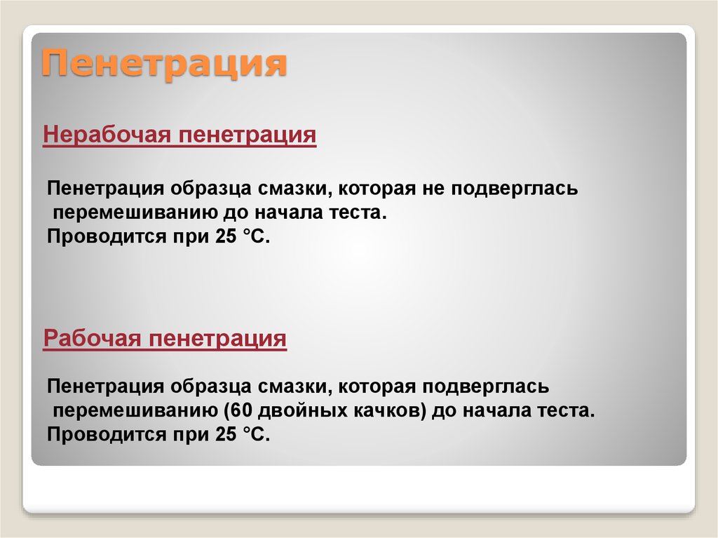 Консистенция смазки — это ее способность сопротивляться деформации под действием приложенной силы. Мера консистенции называется проникновением, которая зависит от того, была ли консистенция изменена в результате обращения или работы.