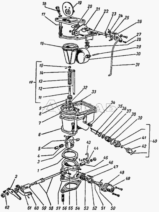 Каждый жиклер состоит из пробки с калиброванным отверстием (собственно жиклера), трубки распылителя и каналов, подводящих бензин от поплавковой камеры к жиклеру и от жиклера к распылителю. Распылители всех жиклеров выведены в блок диффузора карбюратора.Карбюратор состоит из трех основных частей: крышки, корпуса и патрубка. Между крышкой и корпусом карбюратора крепится блок диффузоров. Для герметичности между крышкой и корпусом карбюратора ставится уплотнительная прокладка. Между корпусом карбюратора и патрубком ставится тоже уплотнительная прокладка. В нижней части патрубка имеется фланец, которым с железо асбестовой прокладкой на двух шпильках карбюратор крепится на впускной трубе.В зависимости от режима работы двигателя бензин для приготовления горючей смеси поступает через различные жиклеры карбюратора.При пуске теплого двигателя или при работе на малых оборотах холостого хода бензин поступает в смесительную камеру через жиклер холостого хода.При малых и средних оборотах на режимах малых и средних нагрузок, когда дроссельная заслонка открыта больше, чем при оборотах холостого хода, но меньше, чем при полной нагрузке двигателя, бензин поступает в смесительную камеру только через главный жиклер.