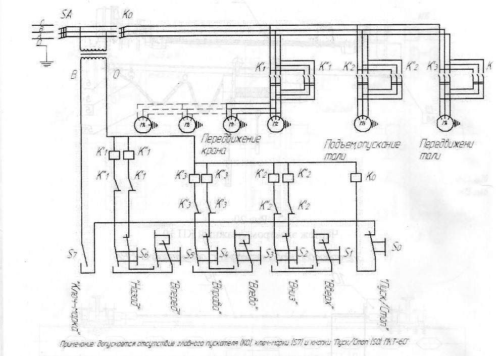 Предохранители (F1-F3) предохраняют трансформаторные обмотки. Ключ (S) подает напряжение в сеть на пускатели. Управление передвижением осуществляется с помощью кнопок S1-S4, подающих ток на катушки К1-К4.
