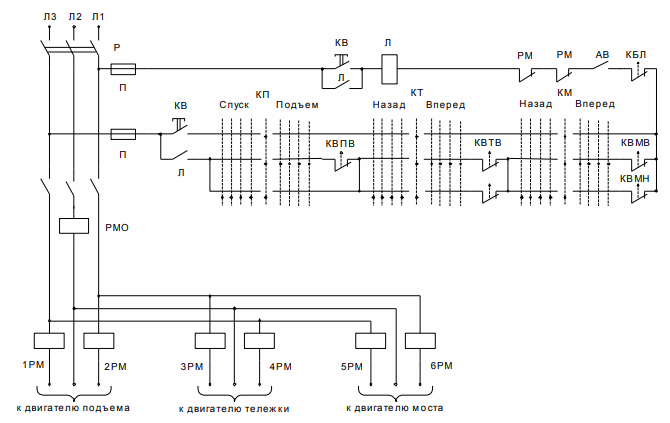 Нажатием кнопки ПУ выполняется подача напряжения на конкретный магнитный пускатель. В результате, электродвигатель перемещает кран в нужном направлении или запускает электролебёдку.