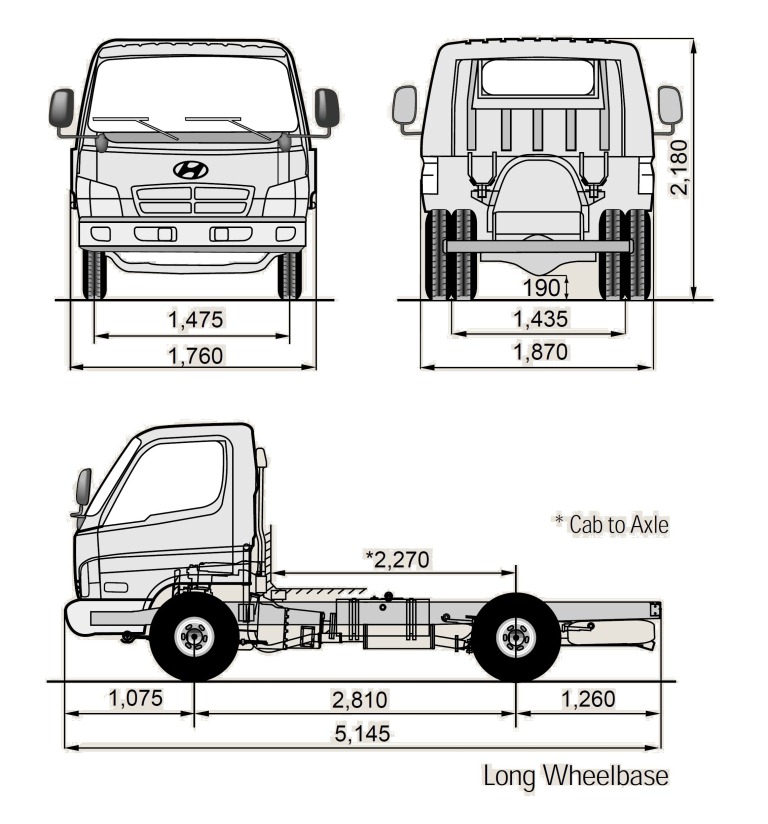 НD65 Long (длинная база), со стандартной кабиной: колёсная база – 3,375 м; длина – 6,170 м; свес сзади – 1,680 м; снаряженная масса – 2,565 тонны; минимальный радиус разворота – 6,1 м. НD65 Long (длинная база), с полуторной кабиной: колёсная база – 3,415 м; длина – 6,380 м; свес сзади – 1,775 м; снаряженная масса – 2,660 тонны; минимальный радиус разворота – 6,1 м. НD65 DBL Cab (дубль кэб), со сдвоенной кабиной: колёсная база – 3,375 м; длина – 6,170 м; свес сзади – 1,680 м; снаряженная масса – 2,810 тонны; минимальный радиус разворота – 6,1 м.