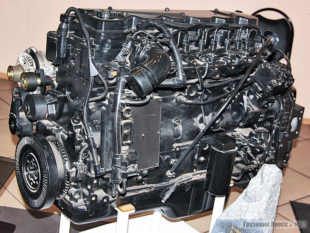 Теперь самое время вспомнить о силовом агрегате. Сегодня их в распоряжении КАМАЗа достаточно как никогда. В соответствии с изложенной концепцией «трёх направлений», это могут быть как агрегаты Daimler, так и свои собственные V-образные моторы модернизированного семейства 740. Есть ещё совместное предприятие, где собирают по лицензии 7-литровый Cummins ISB6.7E4300. В перспективе ведётся сотрудничество с моторостроителями Liebherr, но эта стезя не сулит быстрой выгоды. Но для пяти десятков тонн полной массы тем не менее надо что-то ещё. И тогда на помощь приходит вновь плод совместного… аж трёхстороннего сотрудничества!