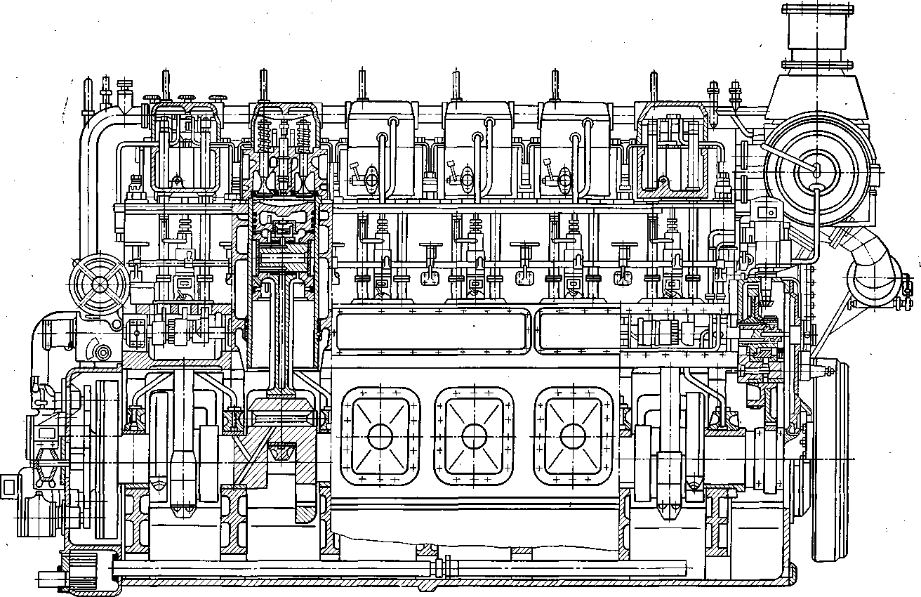 Впускных и выпускных клапанов у рабочих цилиндров по одному. Привод открытия их штанговый. Кулачковые шайбы выполнены в блоках по две. Распределительный вал расположен в специальной полости блока цилиндров. Выпускных коллекторов два. Наддувочный коллектор расположен ниже выпускных. Турбокомпрессор с газовой турбиной осевого типа установлен на кормовом торце двигателя.