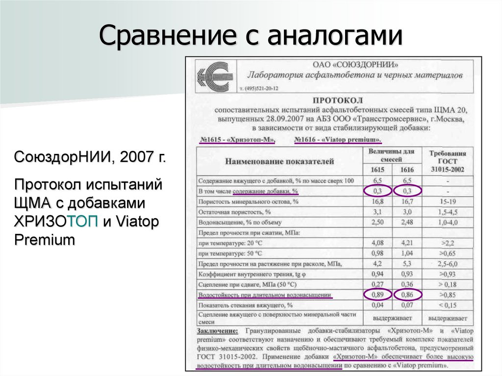 Решение: Требование удовлетворено.Судом первой инстанции верно установлено, что в подтверждение факта ненадлежащего выполнения работ по договору ООО «Анастазис» представлен протокол испытаний ФГБУ «ЦНИПИ» N 109.971 от 06.06.2019, согласно которому испытанная проба (проба 1) асфальтобетона не соответствует требованиям ГОСТ 9128-2013 для смеси асфальтобетонной плотной типа Б марки 1 по процентному содержанию зерен мельче 0,071 и требованиям СП 78.13330.2012 к коэффициенту уплотнения асфальтобетона из смесей типа Б; испытанная проба (проба 2) асфальтобетона не соответствует требованиям ГОСТ 9128-2013 для смеси асфальтобетонной плотной типа Б марки 1 по процентному содержанию зерен мельче 0,071 мм и требованиям СП 78.13330.2012 к коэффициенту уплотнения асфальтобетона из смесей типа Б; в испытанной пробе (проба 3) асфальтобетона превышено ориентировочное содержание битума (ОСТ 9128-2013, прил. Г), а также не соблюдены требования СП 78.13330.2012 к коэффициенту уплотнения асфальтобетона из пористых смесей.