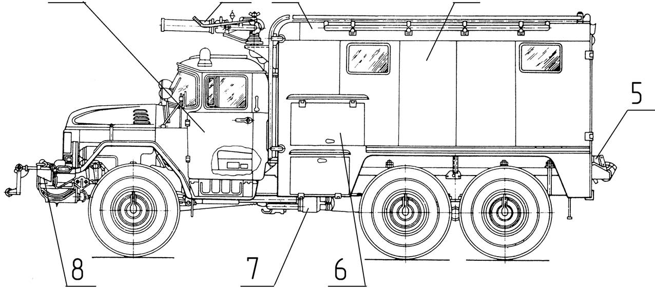 В правом заднем боковом отсеке кузова размещен механизм намотки рукавов. Пульт управления находится там же.
